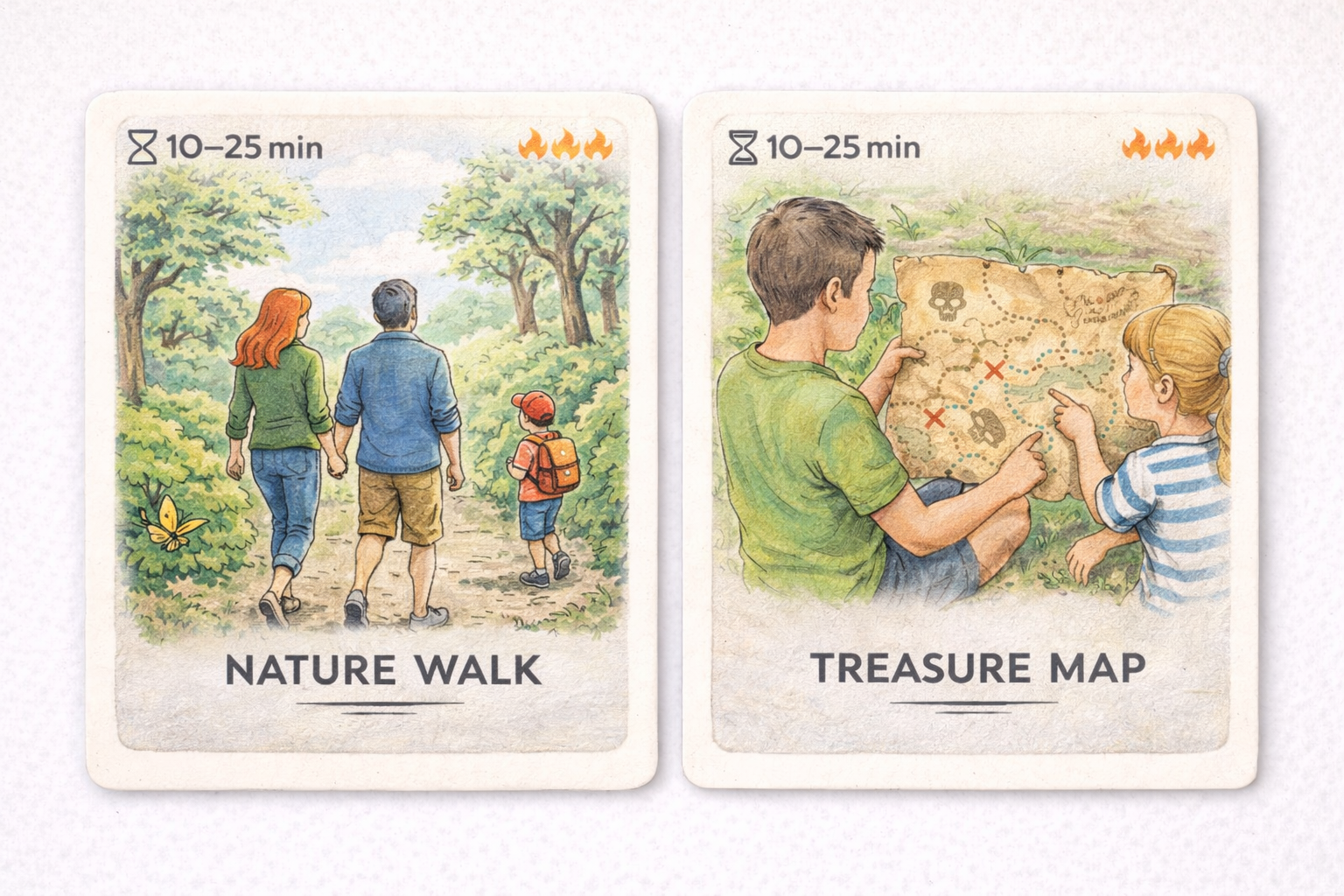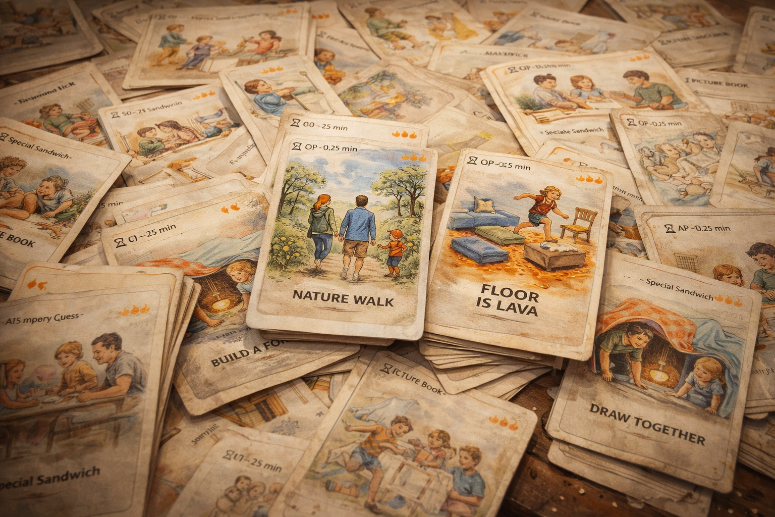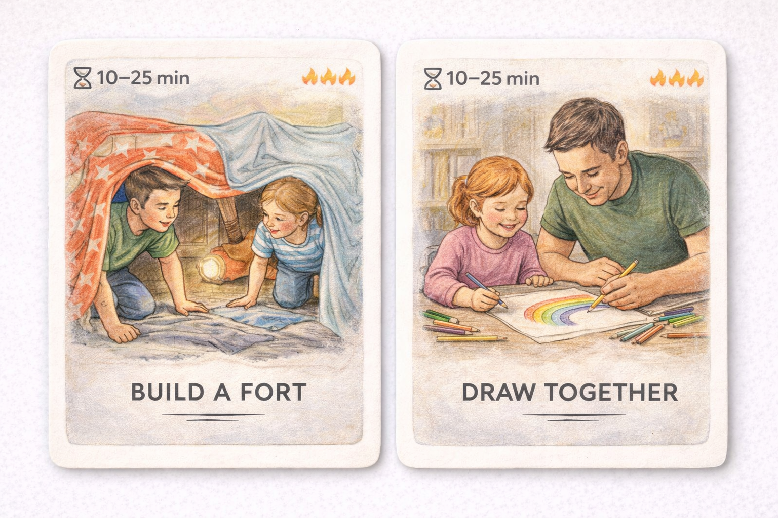 Spend real time together. Pick a card. Do the quest. Laugh, build, explore, create. No screens. No pressure. Just moments you remember..