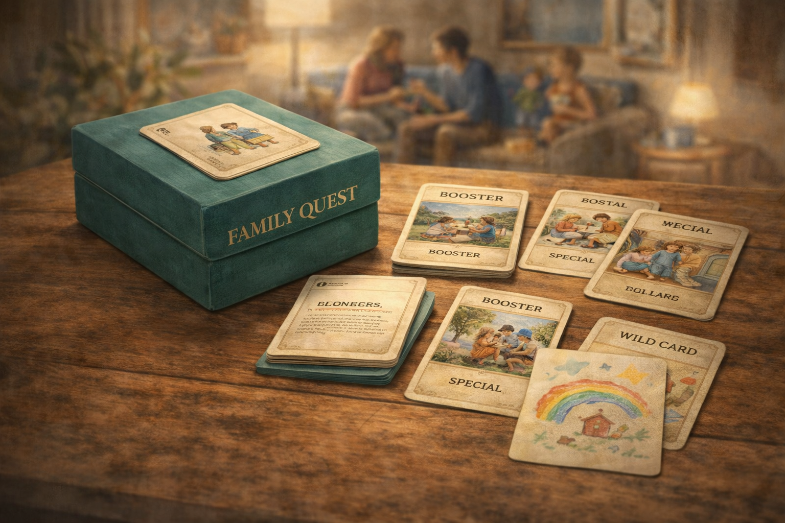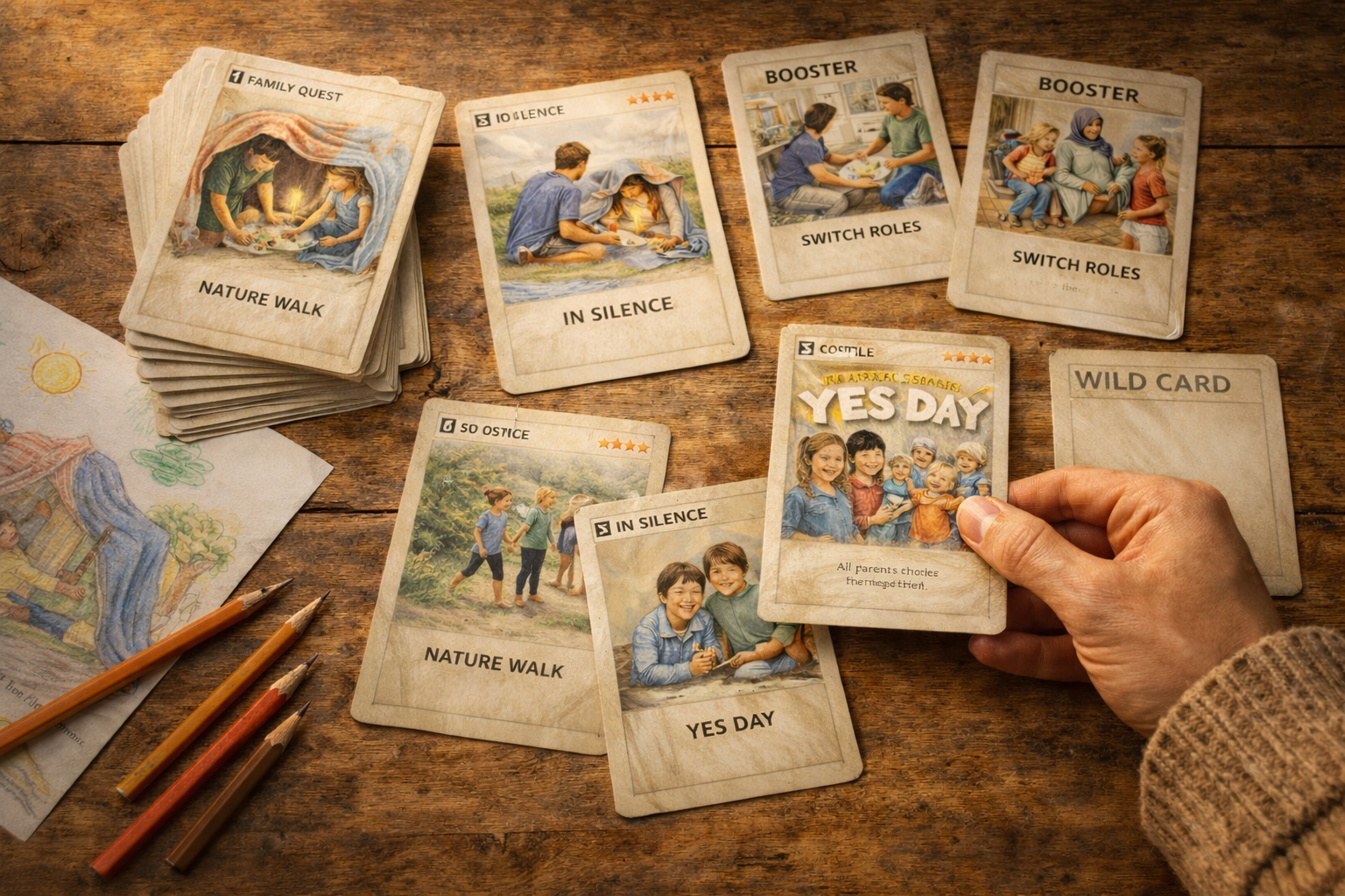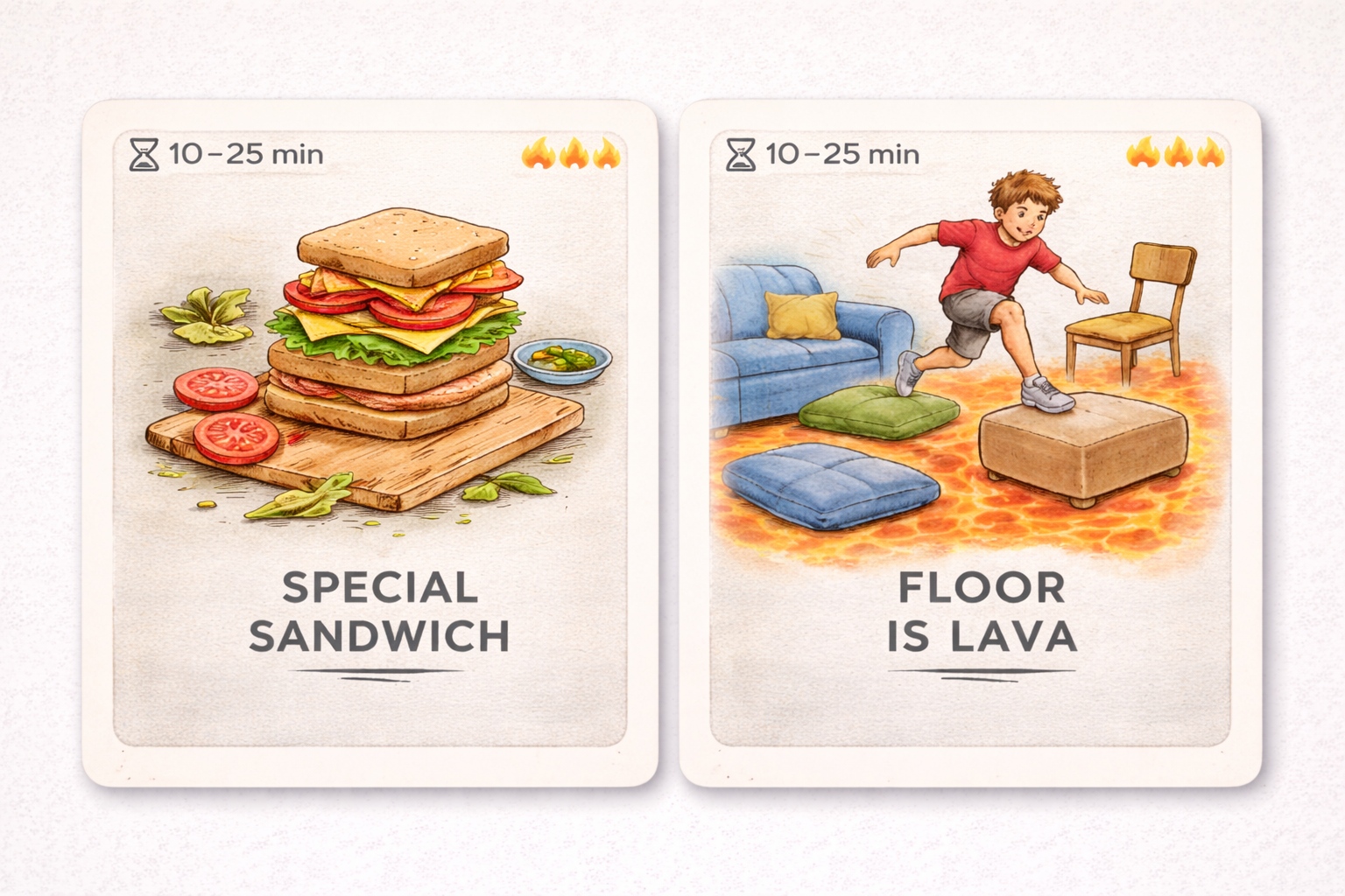 Spend real time together. Pick a card. Do the quest. Laugh, build, explore, create. No screens. No pressure. Just moments you remember..